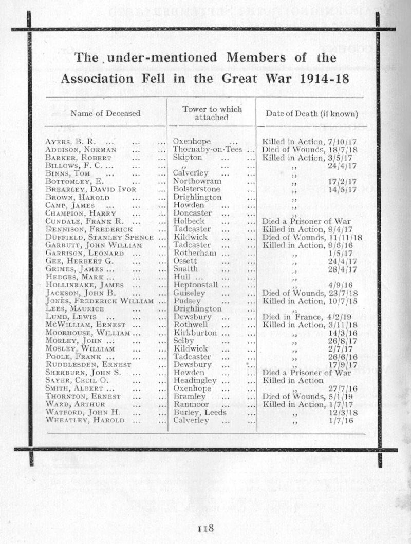 ![]() The Yorkshire Association of Change Ringers annual report for 1920 (vol42-45), lists (on p118) those Members of the Association who fell in the Great War 1914-18. |
